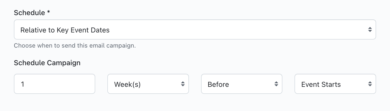 Selecting the 'Relative to Event Key Dates' will provide you with a range of options and fields to choose when the campaign will go out. You first enter the 'Amount' (eg, if you intend for 1 week after Event End, you would enter '1'), and then set the criteria using the remaining options. The example below shows a schedule for 1 week before the event is due to start: