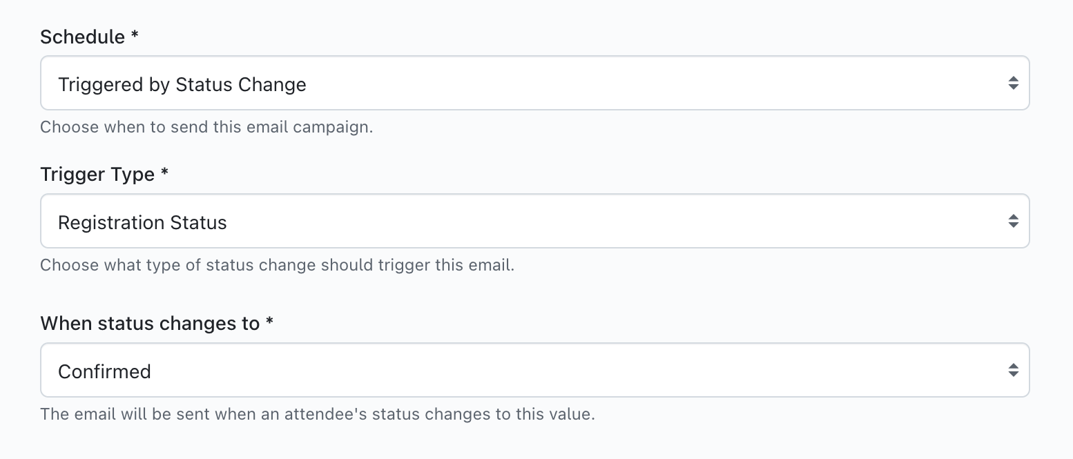 Selecting 'Triggered by Status Change' will create a schedule based on registration or invoice status changes within your attendee audience, which will be sent out as soon as possible following the change. You must first select the 'Trigger Type' (Registration or Invoice Status), and then the status change to trigger the email. This differs between 'Trigger Type' selection - Registration triggers available are 'Confirmed' or 'Cancelled', Invoice triggers are just 'Paid' status changes.