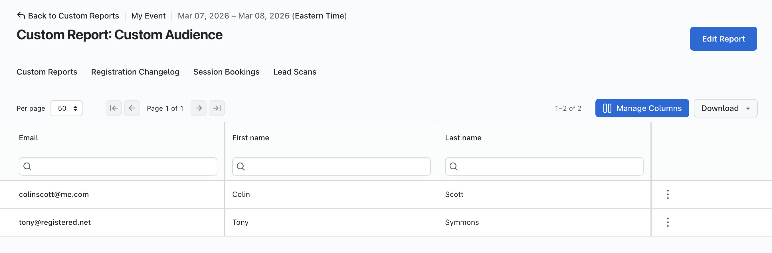 Selecting 'Report Based' allows you to build an audience based on a custom report created in your Custom Reports area. For example, here is a custom report named 'Custom Audience' created in an event: