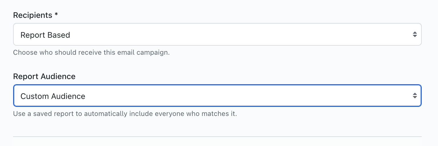 When 'Report Based' is selected, you will have the option to select a report from your Custom Reports area, which will then become the audience for your campaign. In the example below, the report 'Custom Audience' has been selected, and all attendees on this report will now be the selected audience for your campaign: