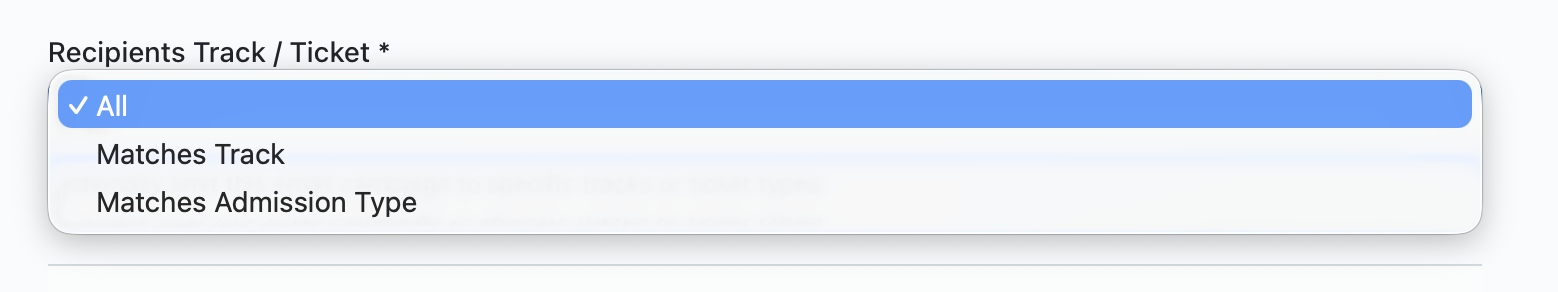 You can further define your campaign audience by selecting whether the recipients match a specific track or admission type for the track. Just make your selection, and a series of checkboxes will be displayed beneath the 'Recipients Track / Ticket' menu.