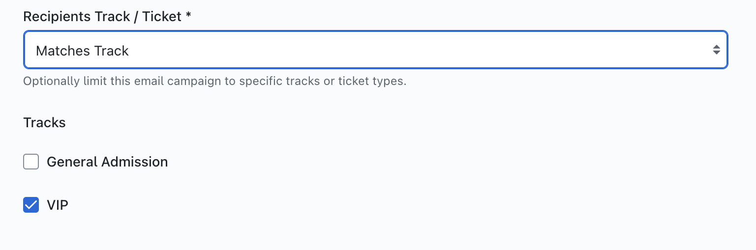 The tracks/ticket types selected here that also match your 'Recipients' criteria will be sent your campaign email once your campaign is saved and submitted.