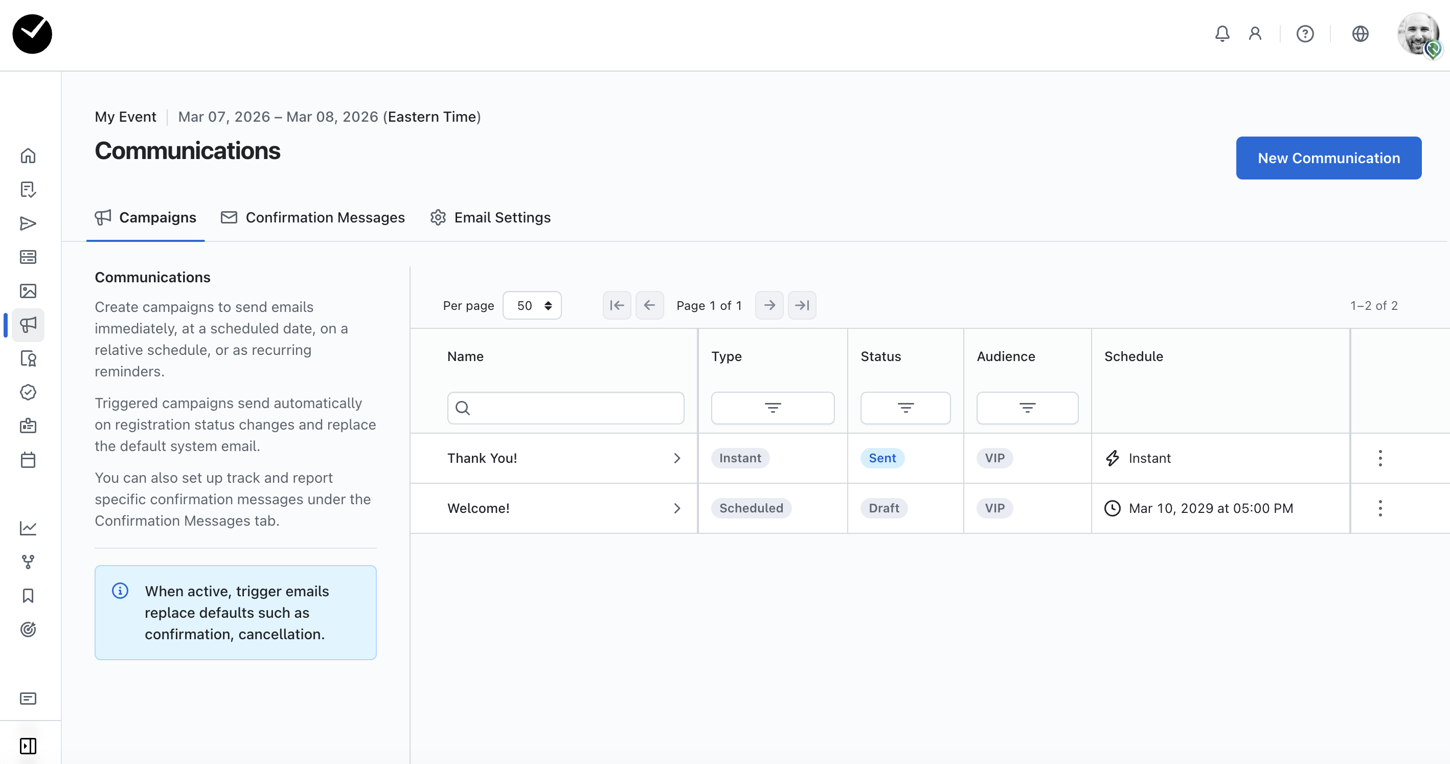 When you initially land on this page, you will be interacting with the 'Campaigns' tab. From here, you can compose your campaign emails, select your audience(s), and schedule delivery as you need. You can also create 'triggered' emails, that will be sent to attendees when their registration or invoice status changes, which replaces the default emails/messages that we provide in getregistered.