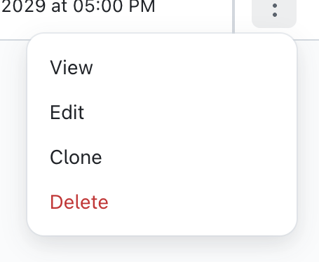 Clicking on the 3 dots at the end of a row will allow you to either 'View', 'Edit', 'Clone' or 'Delete' the relative campaign. If your campaign has already been sent, you will only have the options to 'View' or 'Clone':