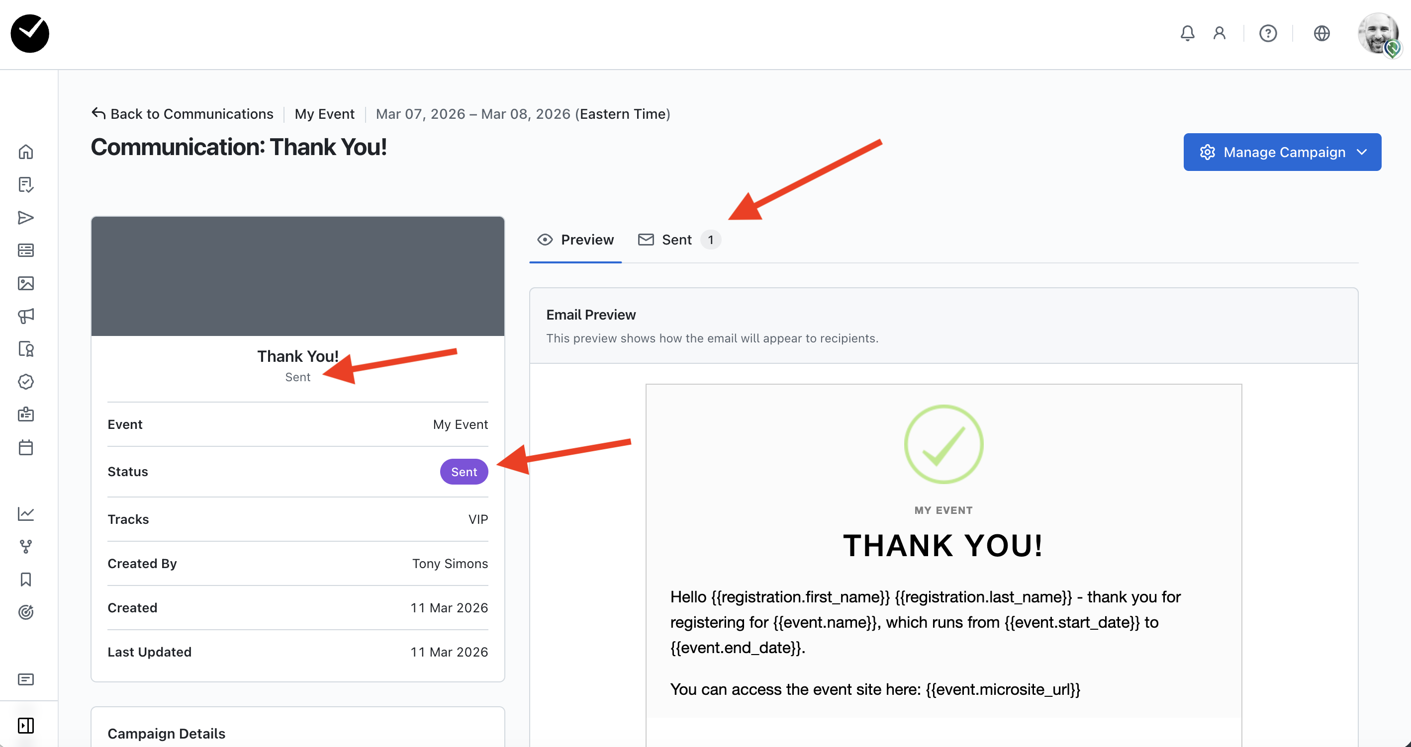 At a higher level, we let you know if your campaign was successfully completed by showing a 'Sent' label on the main Communications/Campaign tab: