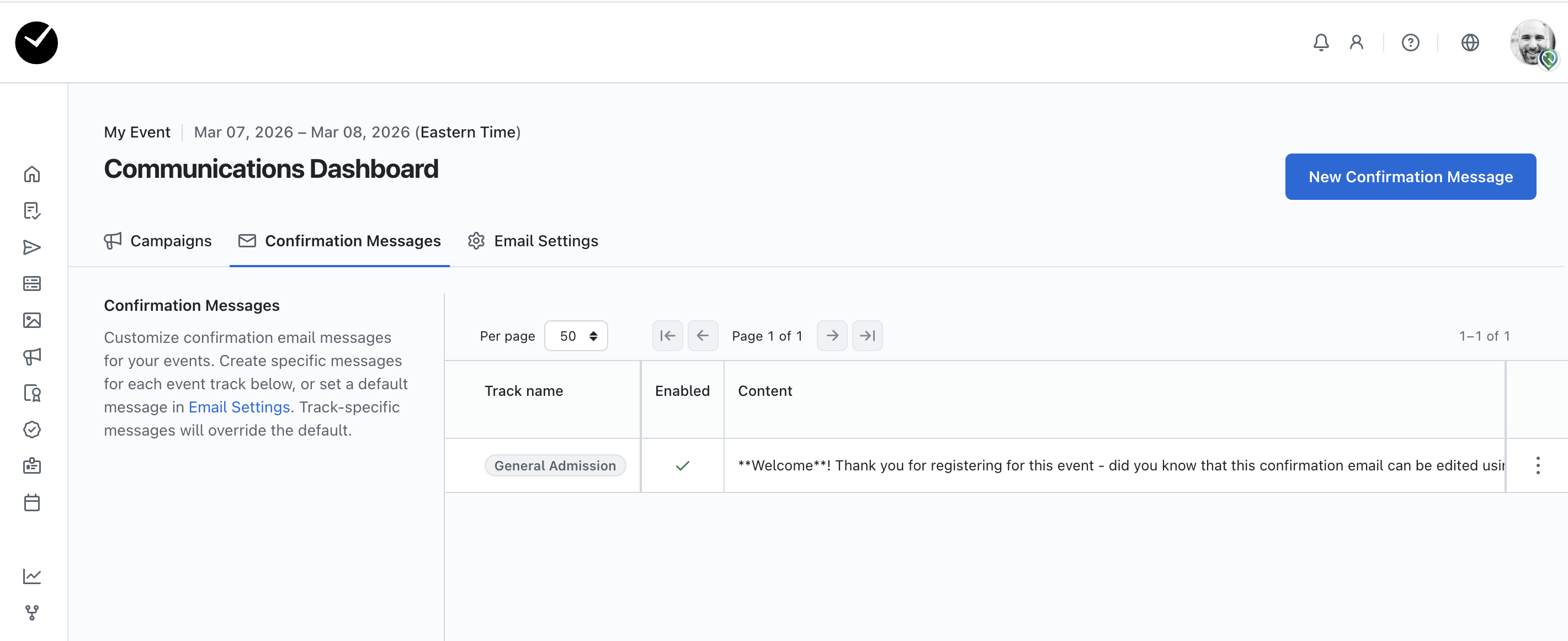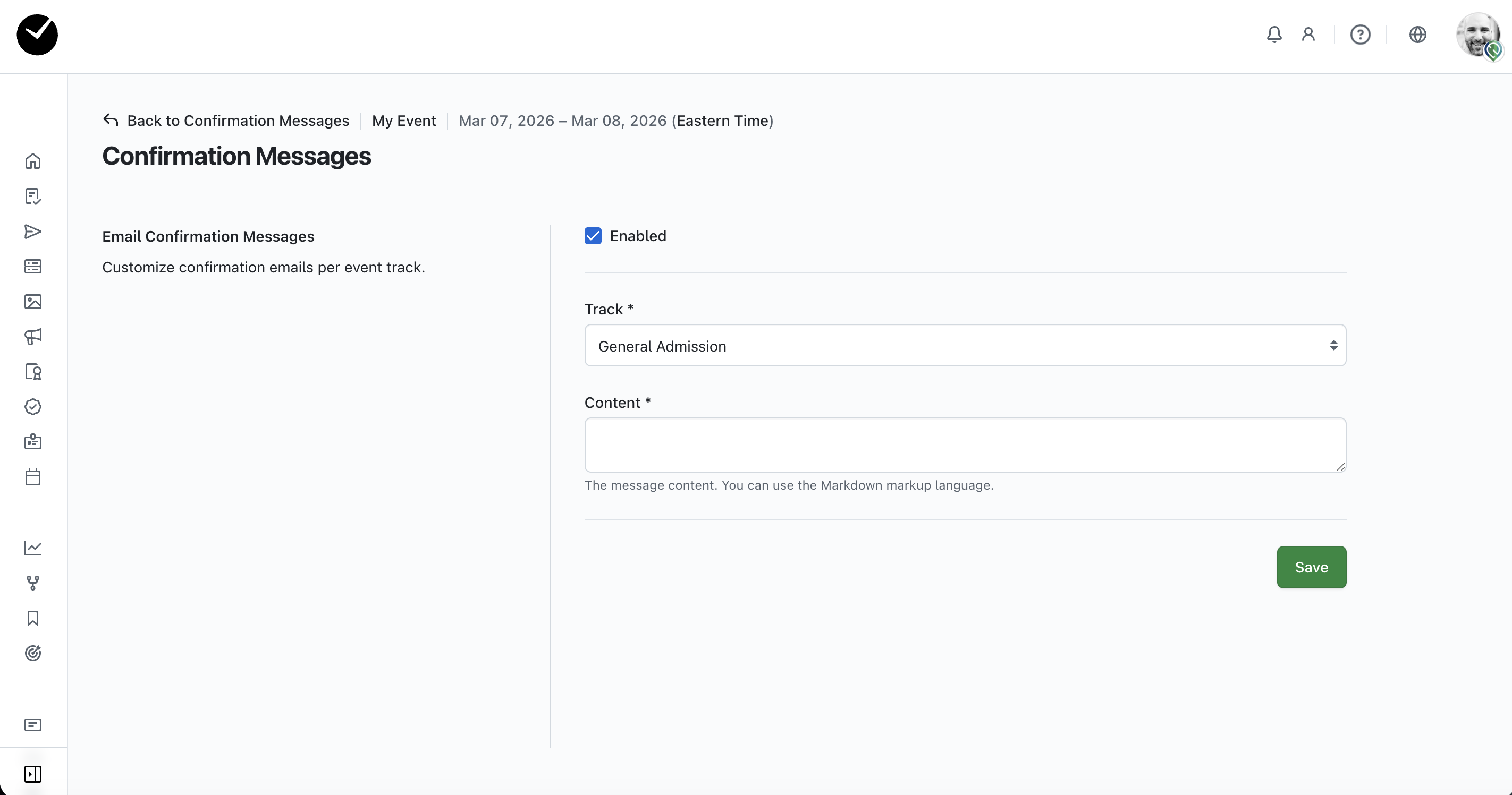 Under the 'Confirmation Messages' tab, you can create your own specific confirmation emails for each event track you have available in your event registration form.