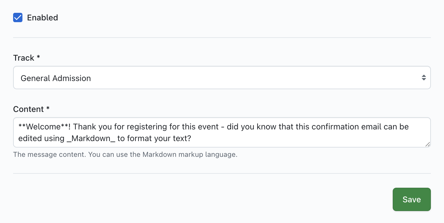 On the form, you will be able to select whether the message is active ('Enabled') or not - when not set to active, the default confirmation email messages will be present in any confirmation emails received by attendees. If your event has 'tracks', you can select the track type to receive your custom message using the dropdown provided, and finally you'll find the 'Content' area, which is where you'll add your custom message - there must be content present and a track selected for you to be able to save your custom message.
