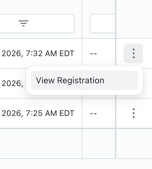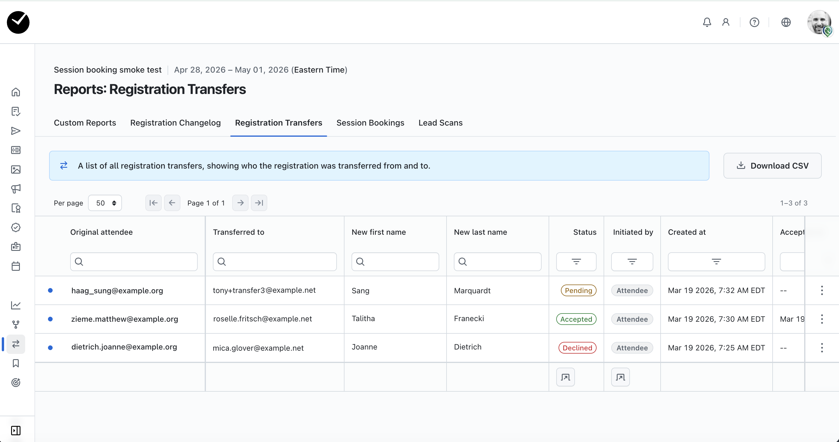 All registration transfer requests can be monitored in this area, showing the status of each transfer and the intended transfer target's name and email address. You can view any of the registrations by clicking on the 3 dots at the end of the relevant attendee row: