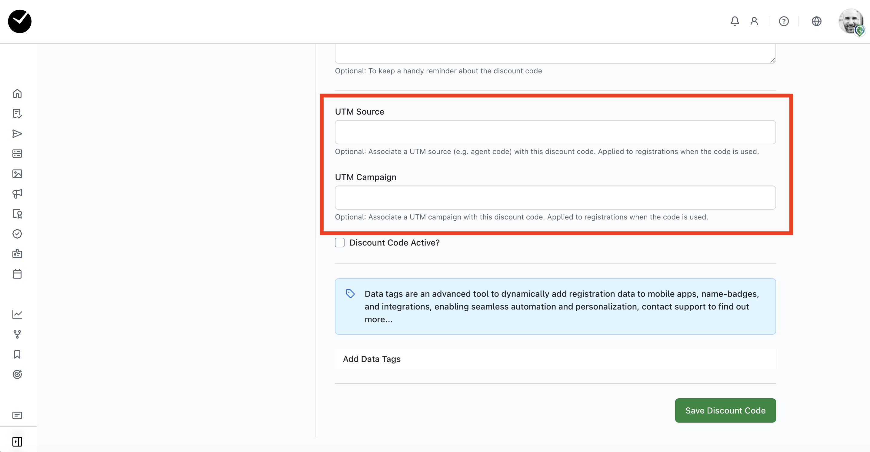 Enter your unique UTM codes here, ensuring that they match the UTM type (source/campaign), and when you're ready, hit 'Save Discount Code'.