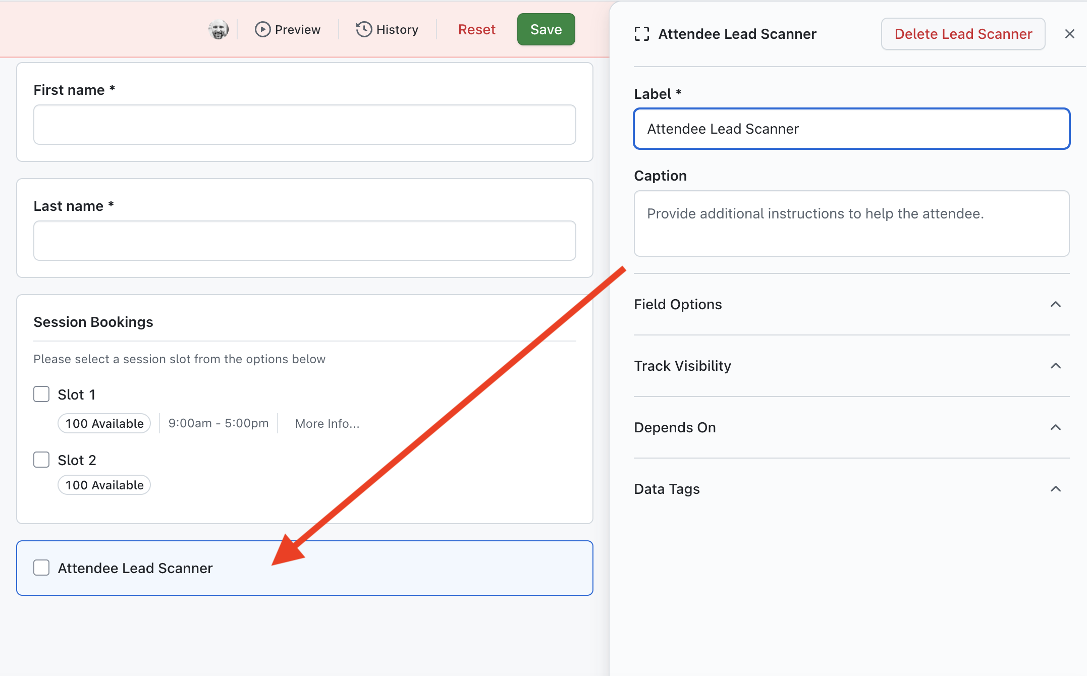 When interacting with your Registration Form Editor, you will see the option 'Lead Scanner' available at the bottom of the Form Builder column (right-hand side of the page):