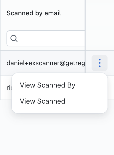 To view the attendees that have scanned/been scanned, click on the 3 dots displayed at the end of the row for the scan you wish to review, and you will see the options to 'View Scanned' and 'View Scanned By' - clicking on either option will take you to the registration 'show' page of the attendee type you selected (scanned/scanned by):