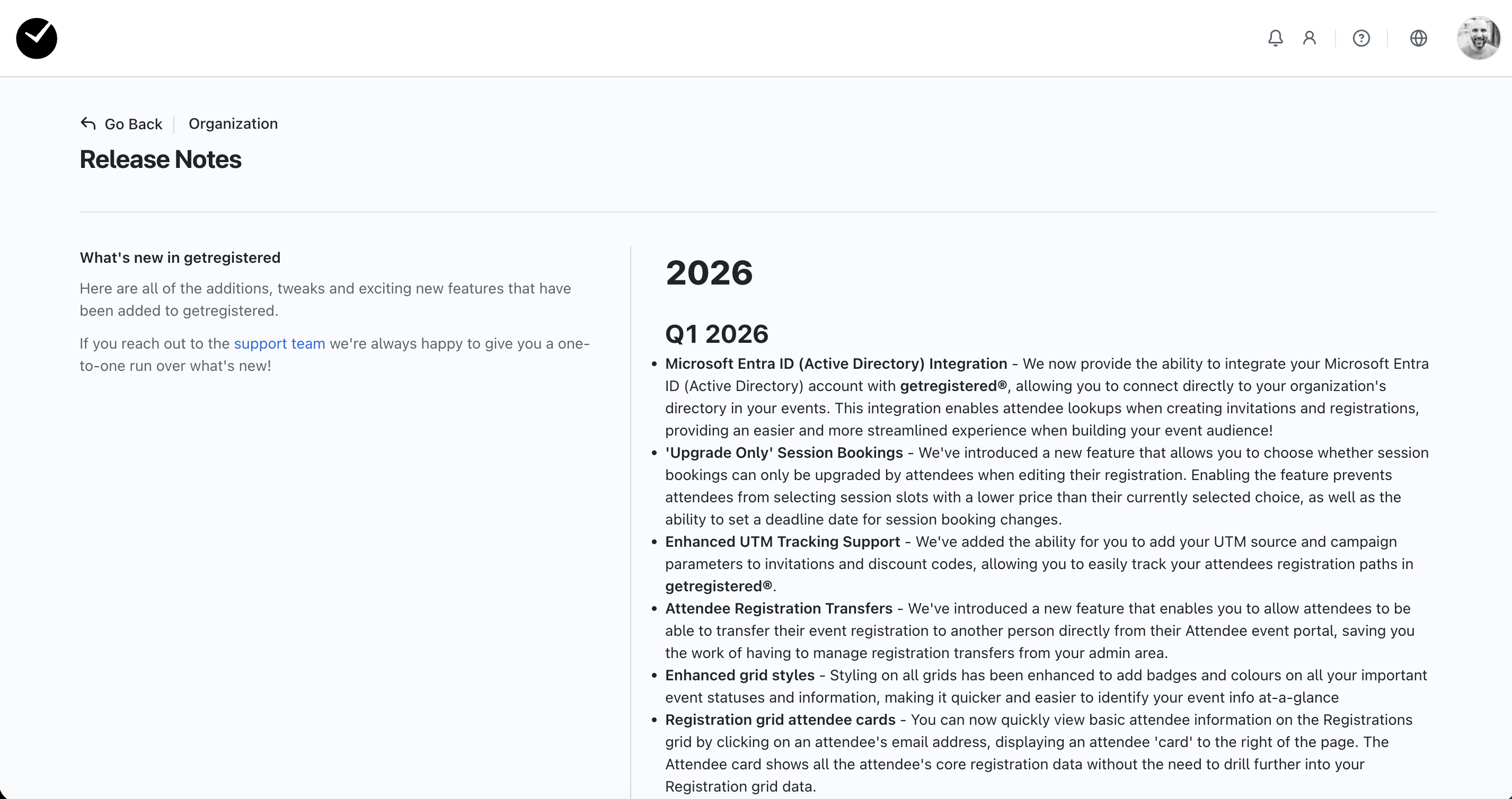 All getregistered® Event Users have the ability to keep up to date on the latest changes in getregistered using our 'Release Notes' area. This area is updated frequently, and details any significant changes to the application in chronological order.