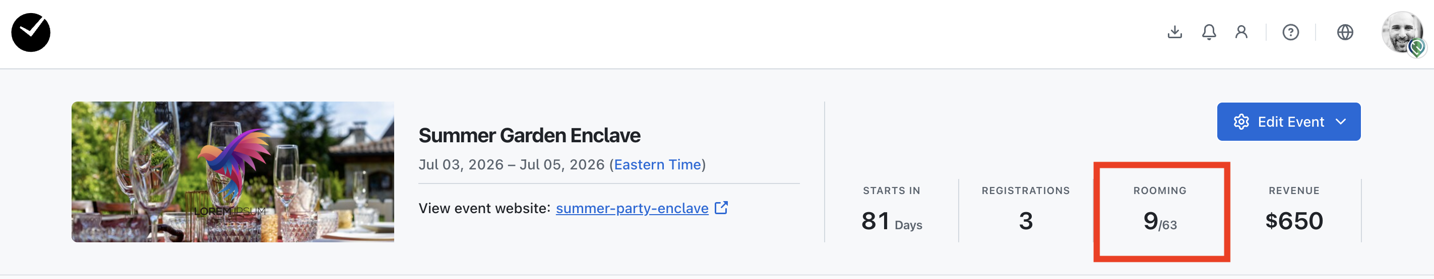 When interacting with your Event Dashboard, we provide you with a snapshot of the number of nights booked for your event at the top right of the page: