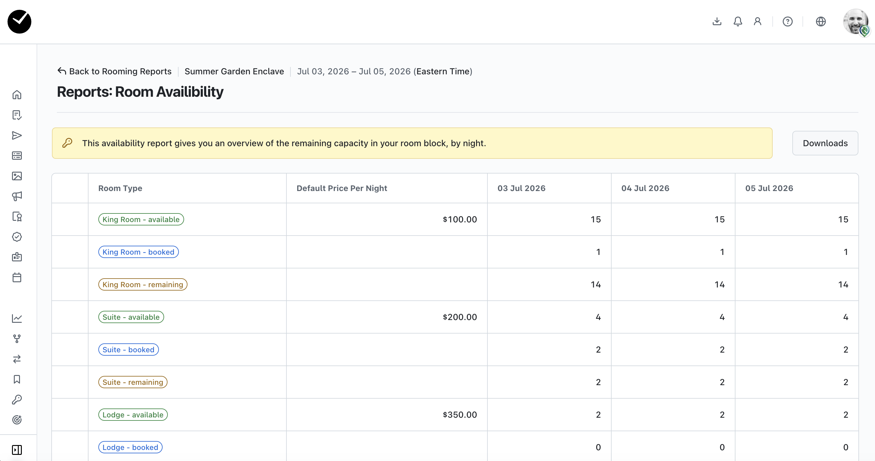 Lists the current availability per night of each room type created on the registration form, grouped by 'Available', 'Booked' and 'Remaining'
