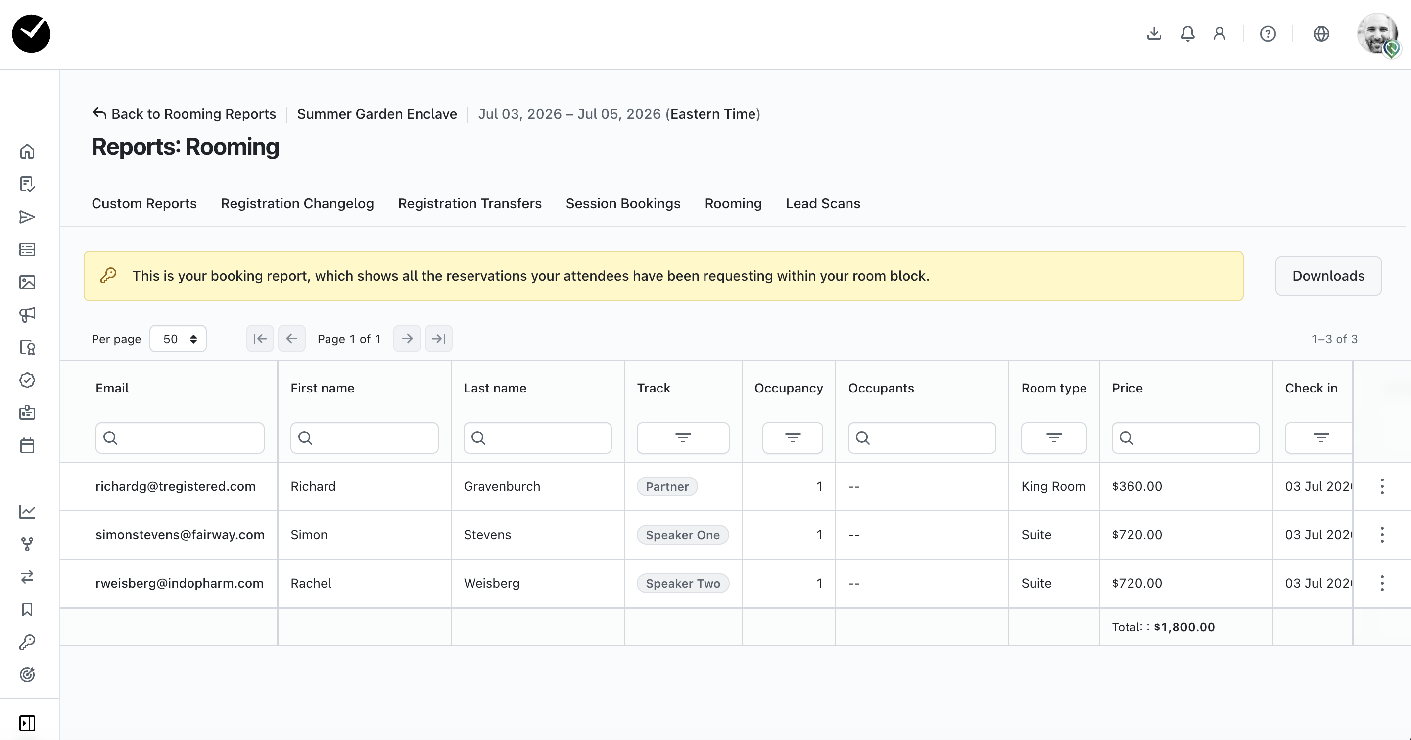 Lists the current bookings per night for each attendee that has reserved a room booking for your event.