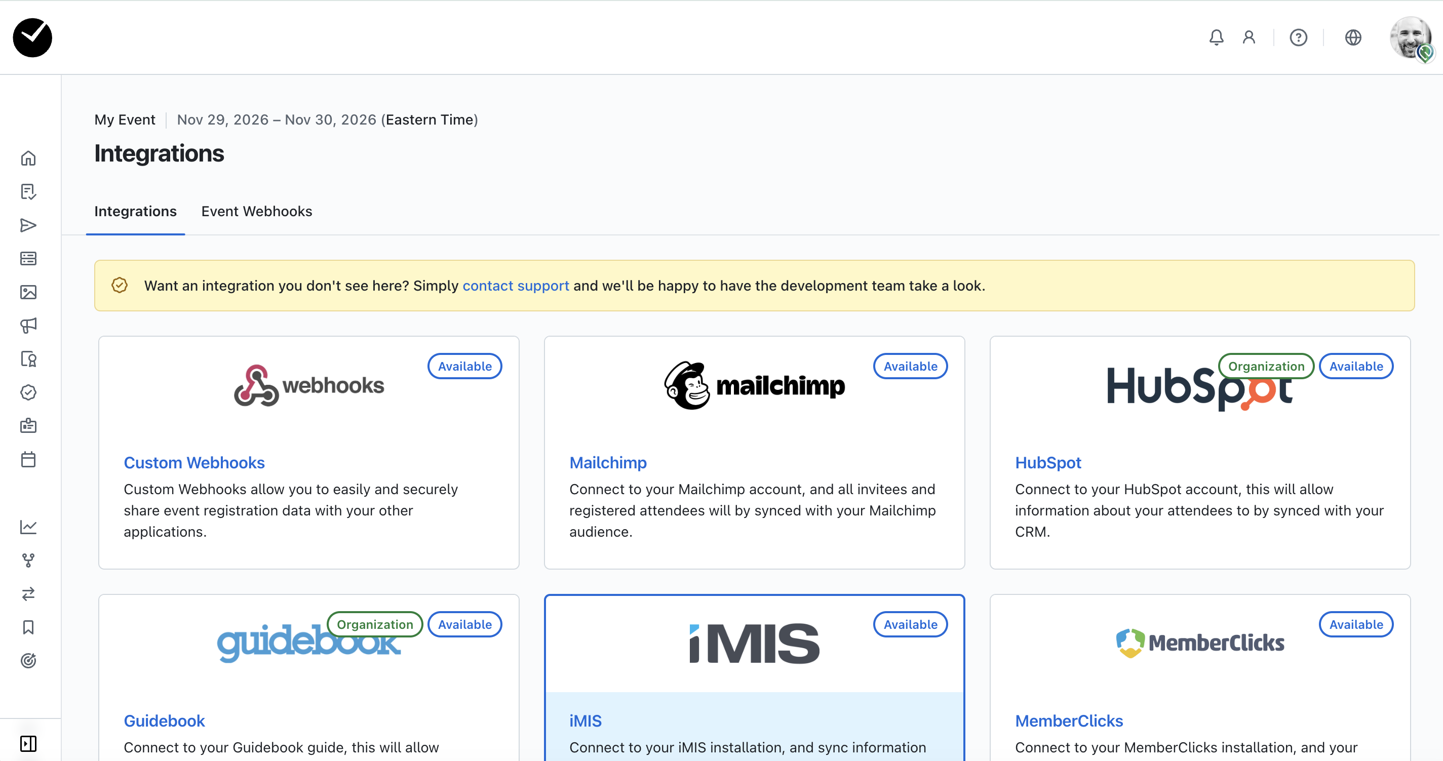 Some of these integrations must be enabled at organization level by us before they can be used (these will have a green 'Organization' label on them), or may require some manual configuration by us for you to use them effectively in your events.